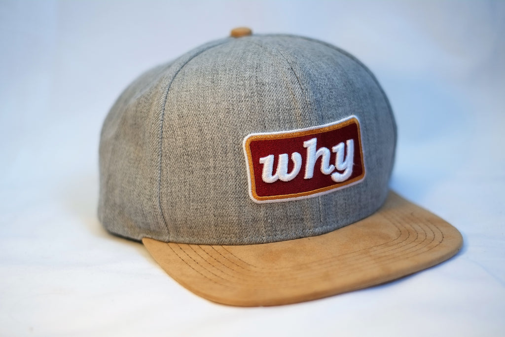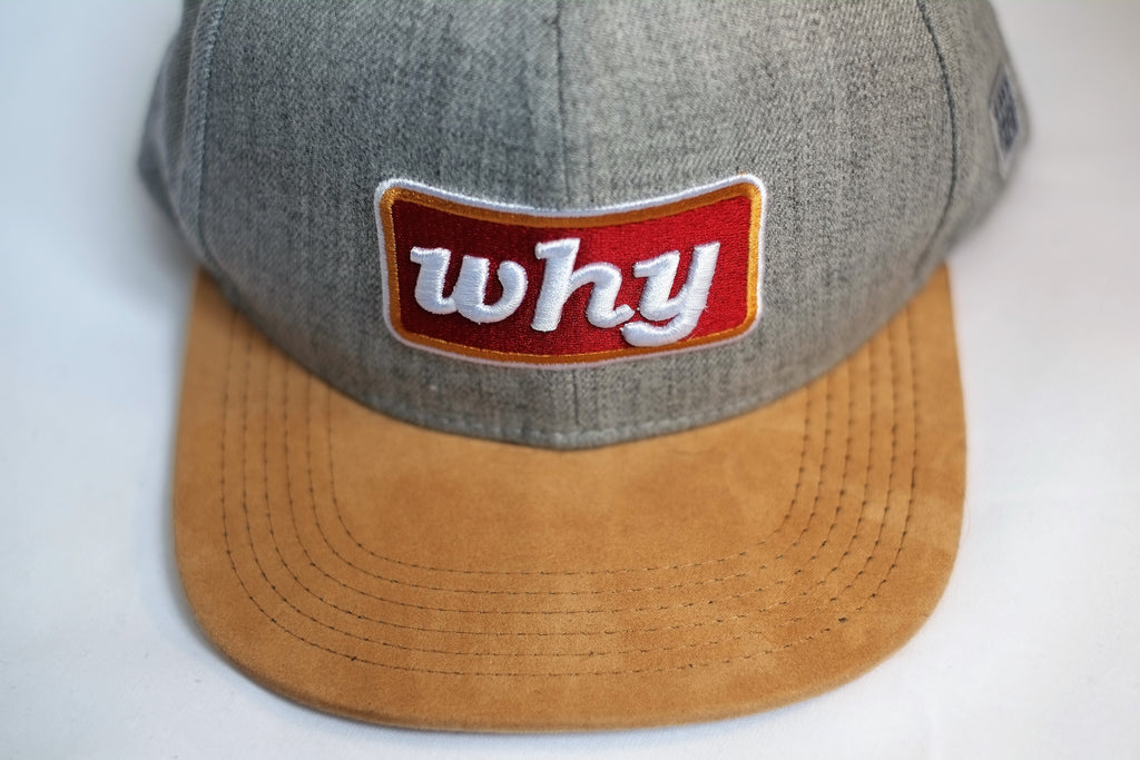 Das WHY EYE II Snapback Cap kommt mit rot-goldenem WHY Logo vorn, grauer Wolle am Kopf und Kunst-Wildleder am Schirm. An der Außenseite ist das Wavy Hope Yard Logo montiert.
